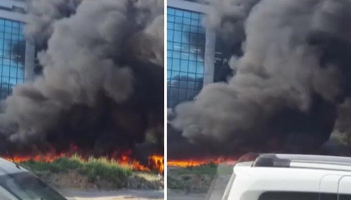 Bir Arnavutkön fabrikasının bahçesindeki plastik ürünler bilinmeyen bir nedenden dolayı yakmaya başladı.