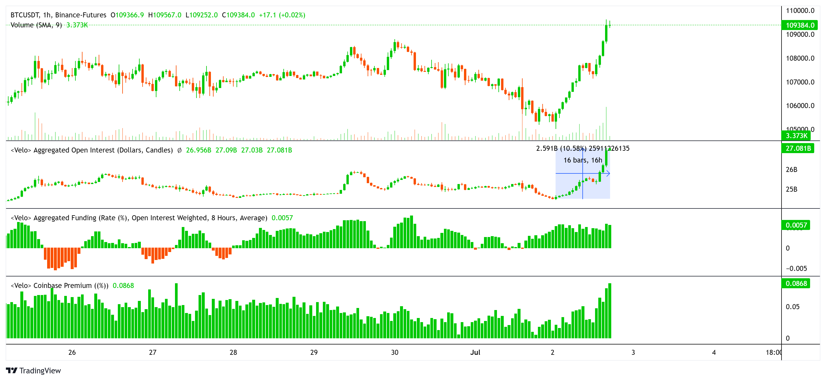 105.200 $ 'dan 109.500 $' a Bitcoin yükseltme, türev pazarlarda önemli hareketlilikle desteklenmiştir, bu da momentumun ele alındığını göstermektedir. Ana ticaret borsalarındaki açık pozisyonlar (OI) yüzde 10 arttı, yani yaklaşık 3,2 milyar dolar. Bu artış esas olarak uzun pozisyonlar ve beklentilere olan güvene neden oldu.