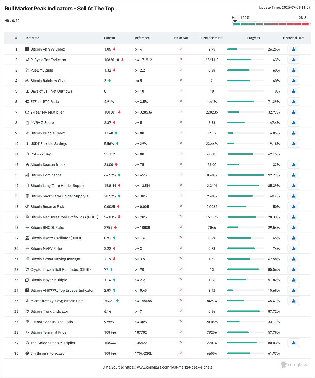 Cotelegraph tarafından bildirildiği gibi, 30 “Boğa Piyasası Zirvesi” göstergeleri, izleme kaynağı olan Coings tarafından “Tut” alanında yüzde 100 oranında kalıyor.